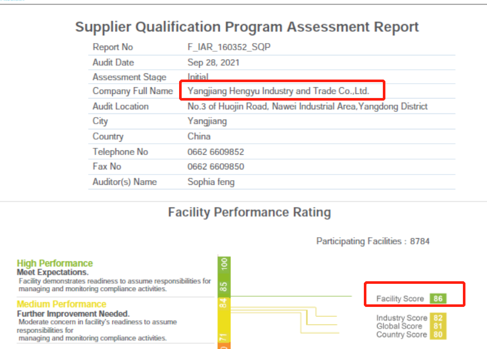 祝陽江恒裕工貿有限公司通過WCA/SQP驗廠,并取得WCA最高等級綠燈86分