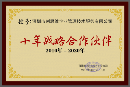 百圖玩具2021年在創(chuàng)思維專業(yè)輔導(dǎo)下一次性通過Macy’s梅西驗(yàn)廠審核,百圖多年來一直與創(chuàng)思維合作通過ICTI驗(yàn)廠,并授權(quán)創(chuàng)思維十年戰(zhàn)略合作伙伴榮譽(yù)證書。攜手創(chuàng)思維-合作共贏,未來可期!